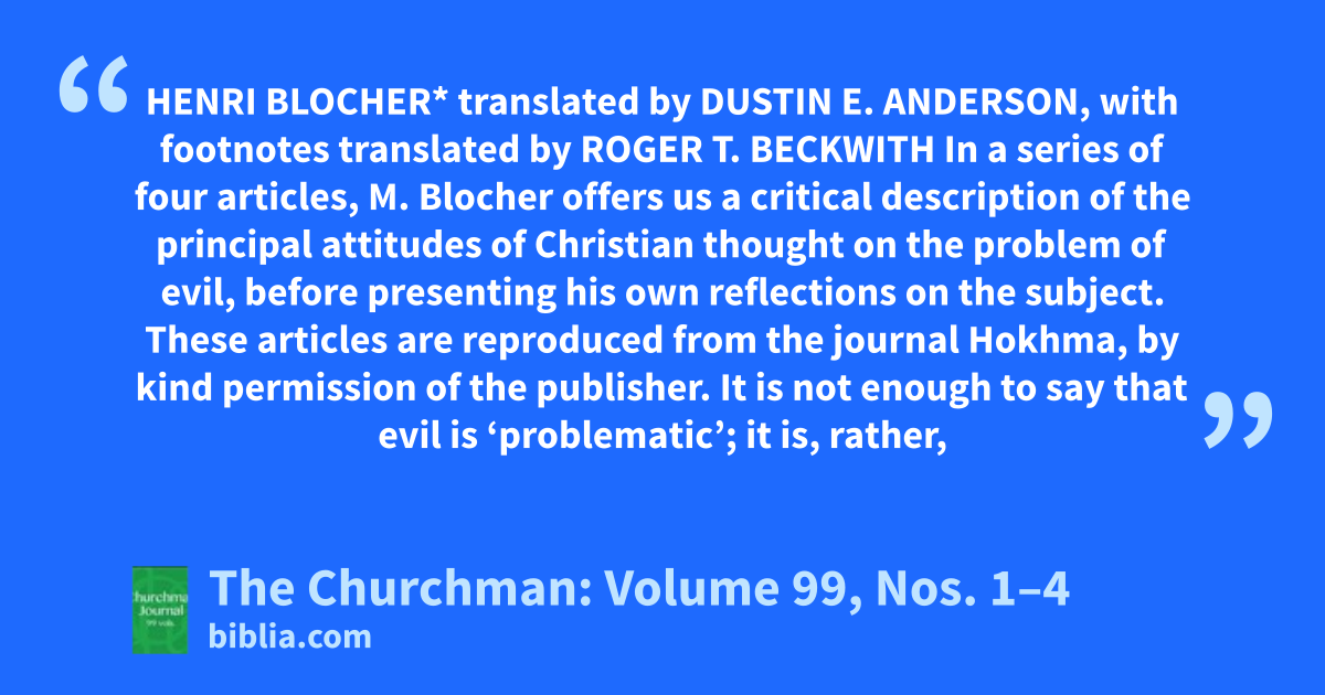 HENRI BLOCHER* translated by DUSTIN E. ANDERSON, with footnotes translated by ROGER T. BECKWITH In a series of four articles, M. Blocher offers us a critical description of the principal attitudes of Christian thought on the problem of evil, before presenting his own reflections on the subject. These articles are reproduced from the journal Hokhma, by kind permission of the publisher. It is not enough to say that evil is ‘problematic’; it is, rather,