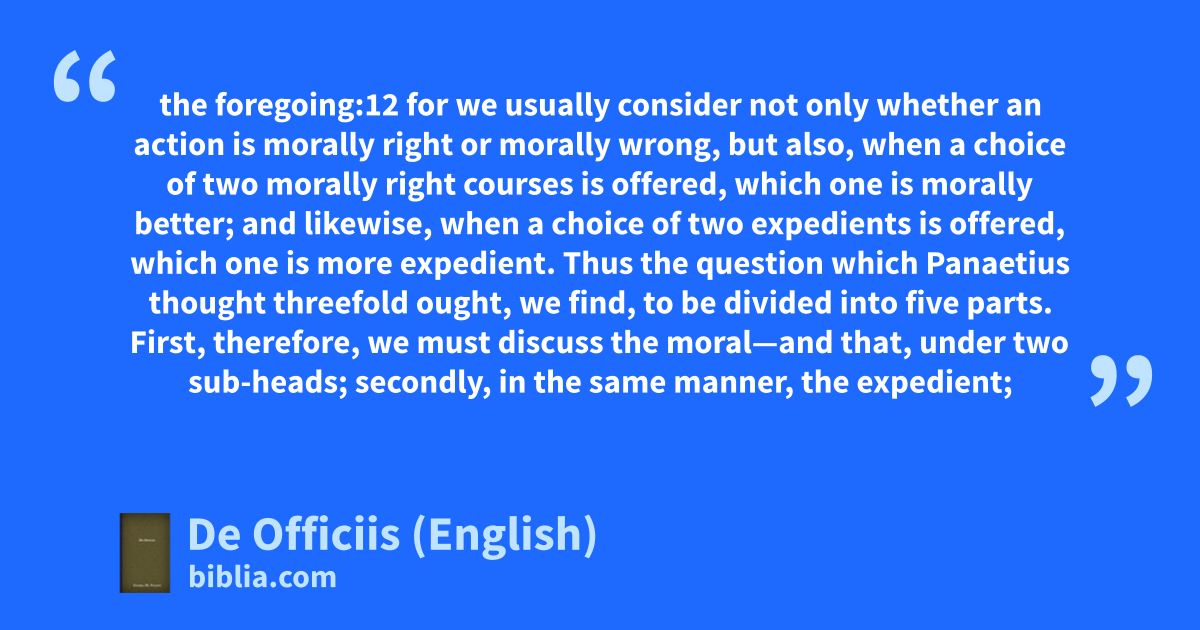 the foregoing:12 for we usually consider not only whether an action is morally right or morally wrong, but also, when a choice of two morally right courses is offered, which one is morally better; and likewise, when a choice of two expedients is offered, which one is more expedient. Thus the question which Panaetius thought threefold ought, we find, to be divided into five parts. First, therefore, we must discuss the moral—and that, under two sub-heads; secondly, in the same manner, the expedient;