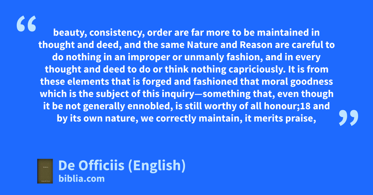 beauty, consistency, order are far more to be maintained in thought and deed, and the same Nature and Reason are careful to do nothing in an improper or unmanly fashion, and in every thought and deed to do or think nothing capriciously. It is from these elements that is forged and fashioned that moral goodness which is the subject of this inquiry—something that, even though it be not generally ennobled, is still worthy of all honour;18 and by its own nature, we correctly maintain, it merits praise,