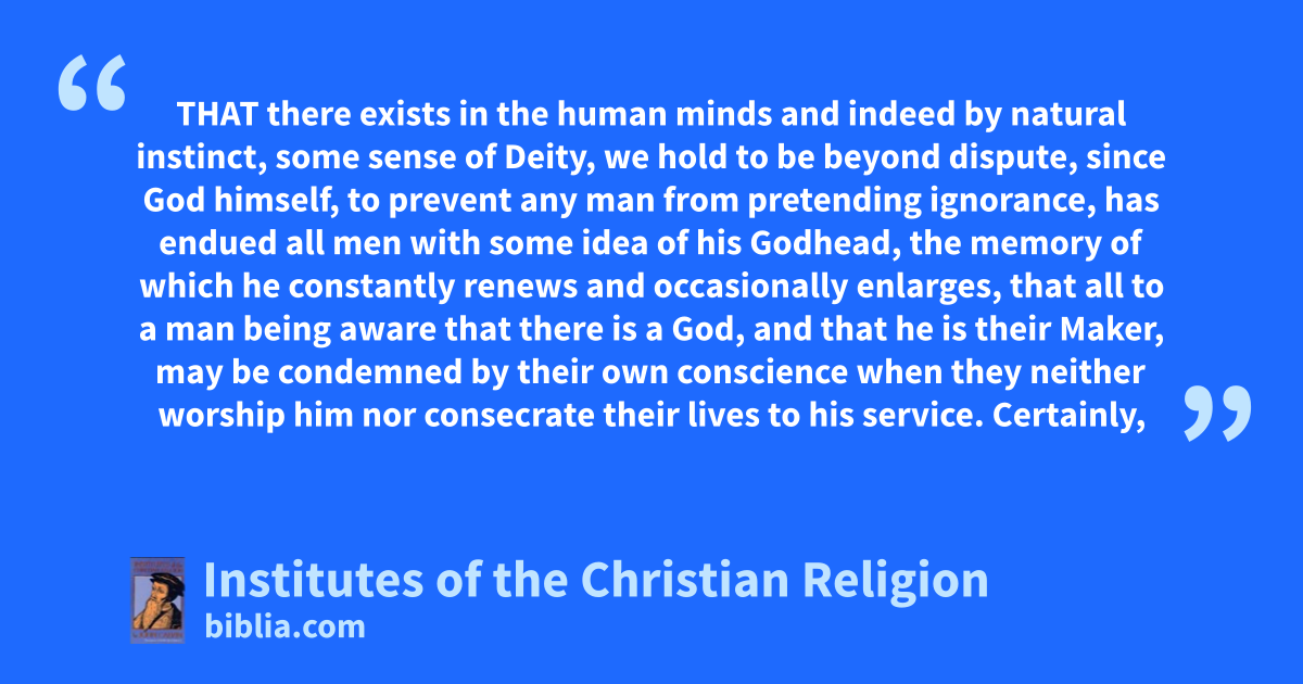 THAT there exists in the human minds and indeed by natural instinct, some sense of Deity, we hold to be beyond dispute, since God himself, to prevent any man from pretending ignorance, has endued all men with some idea of his Godhead, the memory of which he constantly renews and occasionally enlarges, that all to a man being aware that there is a God, and that he is their Maker, may be condemned by their own conscience when they neither worship him nor consecrate their lives to his service. Certainly,