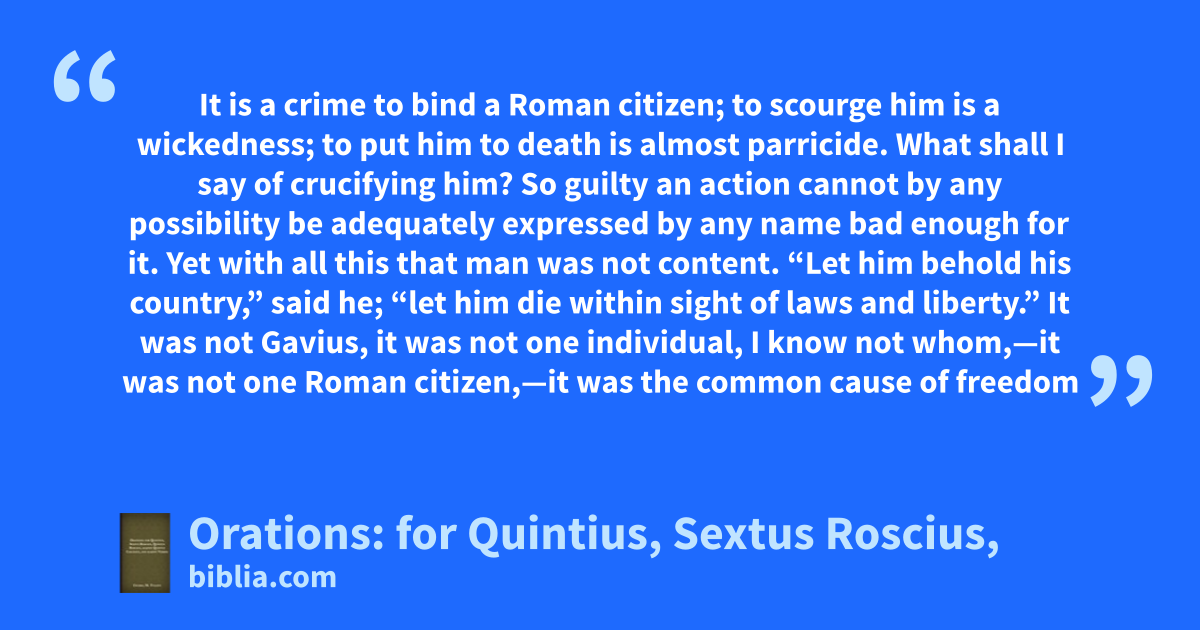 It is a crime to bind a Roman citizen; to scourge him is a wickedness; to put him to death is almost parricide. What shall I say of crucifying him? So guilty an action cannot by any possibility be adequately expressed by any name bad enough for it. Yet with all this that man was not content. “Let him behold his country,” said he; “let him die within sight of laws and liberty.” It was not Gavius, it was not one individual, I know not whom,—it was not one Roman citizen,—it was the common cause of freedom