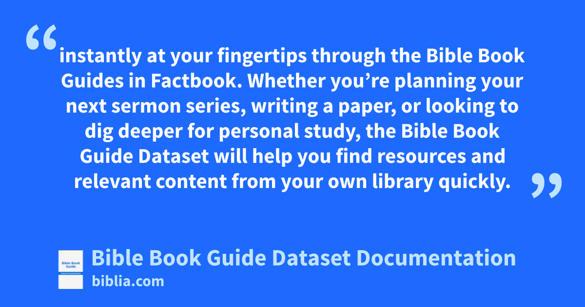 As your library grows, it can be difficult to navigate the large number of biblical commentaries, encyclopedias, and other reference works. The Bible Book Guide exists to provide introductory, overview, and summary information on the books of the Bible. A Bible book’s overview, outline, authorship, date, and more are instantly at your fingertips through the Bible Book Guides in Factbook. Whether...