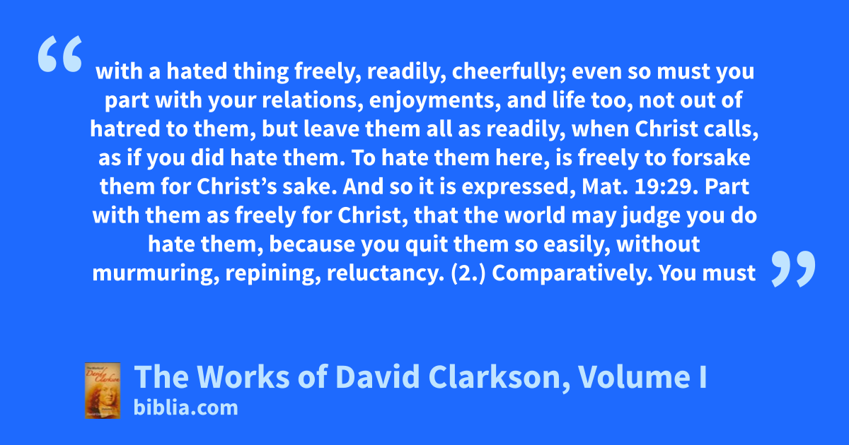 with a hated thing freely, readily, cheerfully; even so must you part with your relations, enjoyments, and life too, not out of hatred to them, but leave them all as readily, when Christ calls, as if you did hate them. To hate them here, is freely to forsake them for Christ’s sake. And so it is expressed, Mat. 19:29. Part with them as freely for Christ, that the world may judge you do hate them, because you quit them so easily, without murmuring, repining, reluctancy. (2.) Comparatively. You must