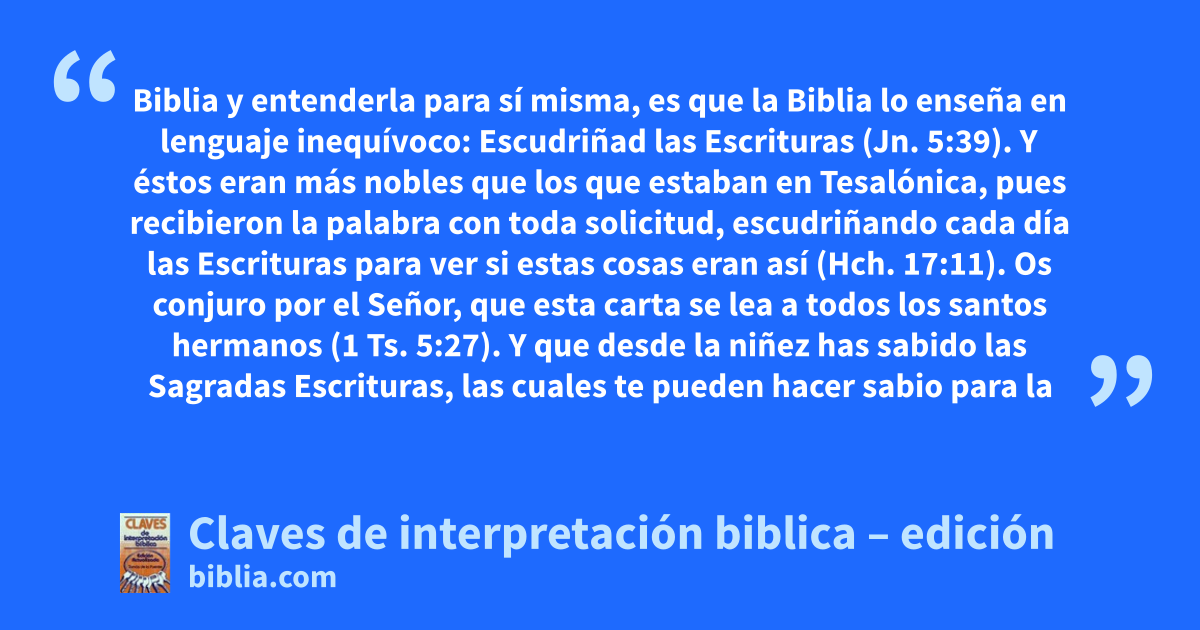 Biblia y entenderla para sí misma, es que la Biblia lo enseña en lenguaje inequívoco: Escudriñad las Escrituras (Jn. 5:39). Y éstos eran más nobles que los que estaban en Tesalónica, pues recibieron la palabra con toda solicitud, escudriñando cada día las Escrituras para ver si estas cosas eran así (Hch. 17:11). Os conjuro por el Señor, que esta carta se lea a todos los santos hermanos (1 Ts. 5:27). Y que desde la niñez has sabido las Sagradas Escrituras, las cuales te pueden hacer sabio para la