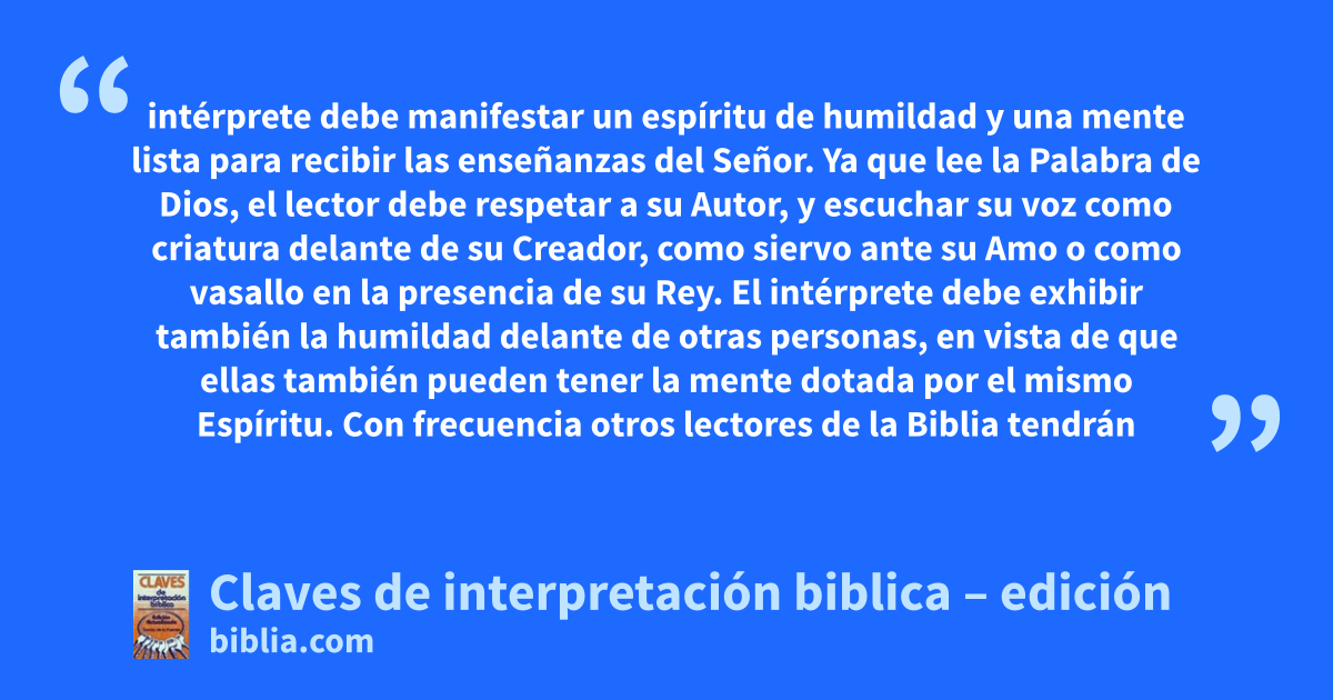 intérprete debe manifestar un espíritu de humildad y una mente lista para recibir las enseñanzas del Señor. Ya que lee la Palabra de Dios, el lector debe respetar a su Autor, y escuchar su voz como criatura delante de su Creador, como siervo ante su Amo o como vasallo en la presencia de su Rey. El intérprete debe exhibir también la humildad delante de otras personas, en vista de que ellas también pueden tener la mente dotada por el mismo Espíritu. Con frecuencia otros lectores de la Biblia tendrán