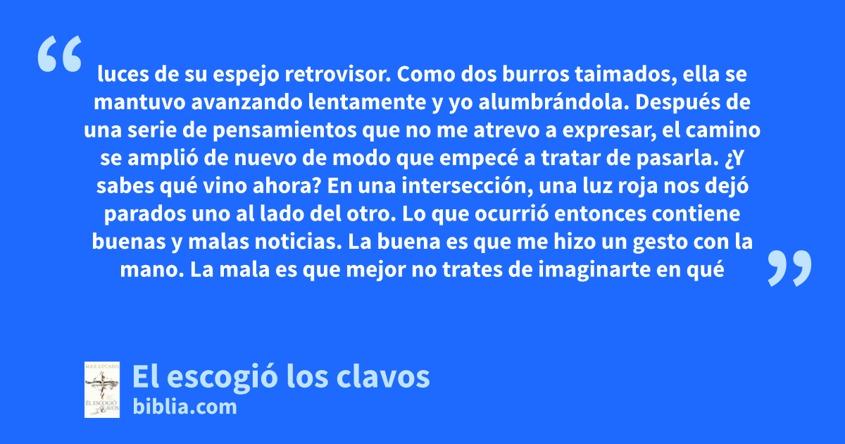 luces de su espejo retrovisor. Como dos burros taimados, ella se mantuvo avanzando lentamente y yo alumbrándola. Después de una serie de pensamientos que no me atrevo a expresar, el camino se amplió de nuevo de modo que empecé a tratar de pasarla. ¿Y sabes qué vino ahora? En una intersección, una luz roja nos dejó parados uno al lado del otro. Lo que ocurrió entonces contiene buenas y malas noticias. La buena es que me hizo un gesto con la mano. La mala es que mejor no trates de imaginarte en qué