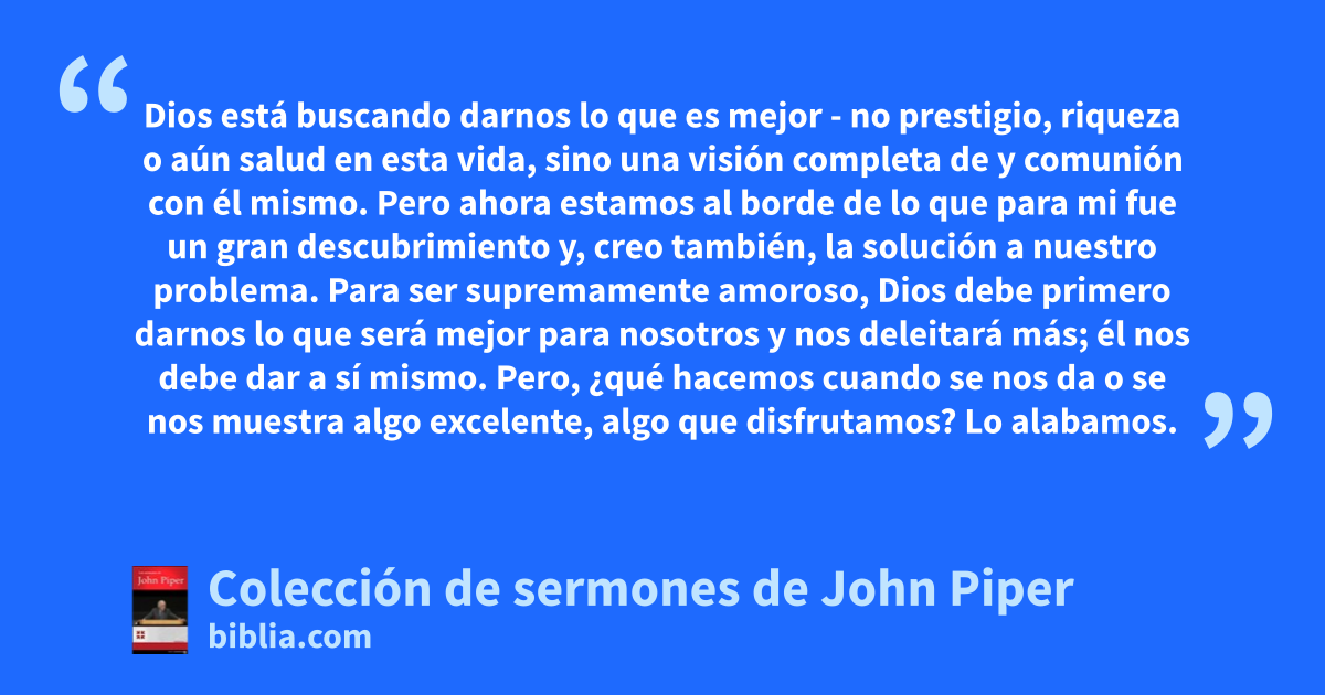 Dios está buscando darnos lo que es mejor - no prestigio, riqueza o aún salud en esta vida, sino una visión completa de y comunión con él mismo. Pero ahora estamos al borde de lo que para mi fue un gran descubrimiento y, creo también, la solución a nuestro problema. Para ser supremamente amoroso, Dios debe primero darnos lo que será mejor para nosotros y nos deleitará más; él nos debe dar a sí mismo. Pero, ¿qué hacemos cuando se nos da o se nos muestra algo excelente, algo que disfrutamos? Lo alabamos.