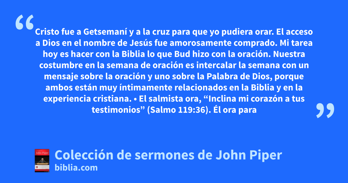 Cristo fue a Getsemaní y a la cruz para que yo pudiera orar. El acceso a Dios en el nombre de Jesús fue amorosamente comprado. Mi tarea hoy es hacer con la Biblia lo que Bud hizo con la oración. Nuestra costumbre en la semana de oración es intercalar la semana con un mensaje sobre la oración y uno sobre la Palabra de Dios, porque ambos están muy íntimamente relacionados en la Biblia y en la experiencia cristiana. • El salmista ora, “Inclina mi corazón a tus testimonios” (Salmo 119:36). Él ora para