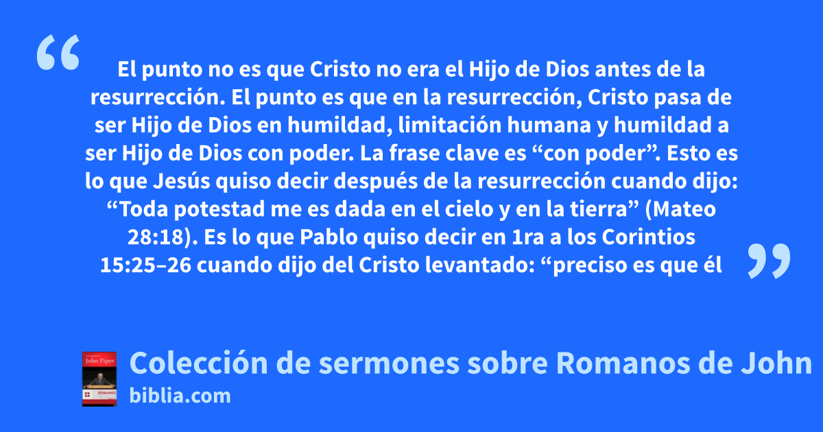 El punto no es que Cristo no era el Hijo de Dios antes de la resurrección. El punto es que en la resurrección, Cristo pasa de ser Hijo de Dios en humildad, limitación humana y humildad a ser Hijo de Dios con poder. La frase clave es “con poder”. Esto es lo que Jesús quiso decir después de la resurrección cuando dijo: “Toda potestad me es dada en el cielo y en la tierra” (Mateo 28:18). Es lo que Pablo quiso decir en 1ra a los Corintios 15:25–26 cuando dijo del Cristo levantado: “preciso es que él
