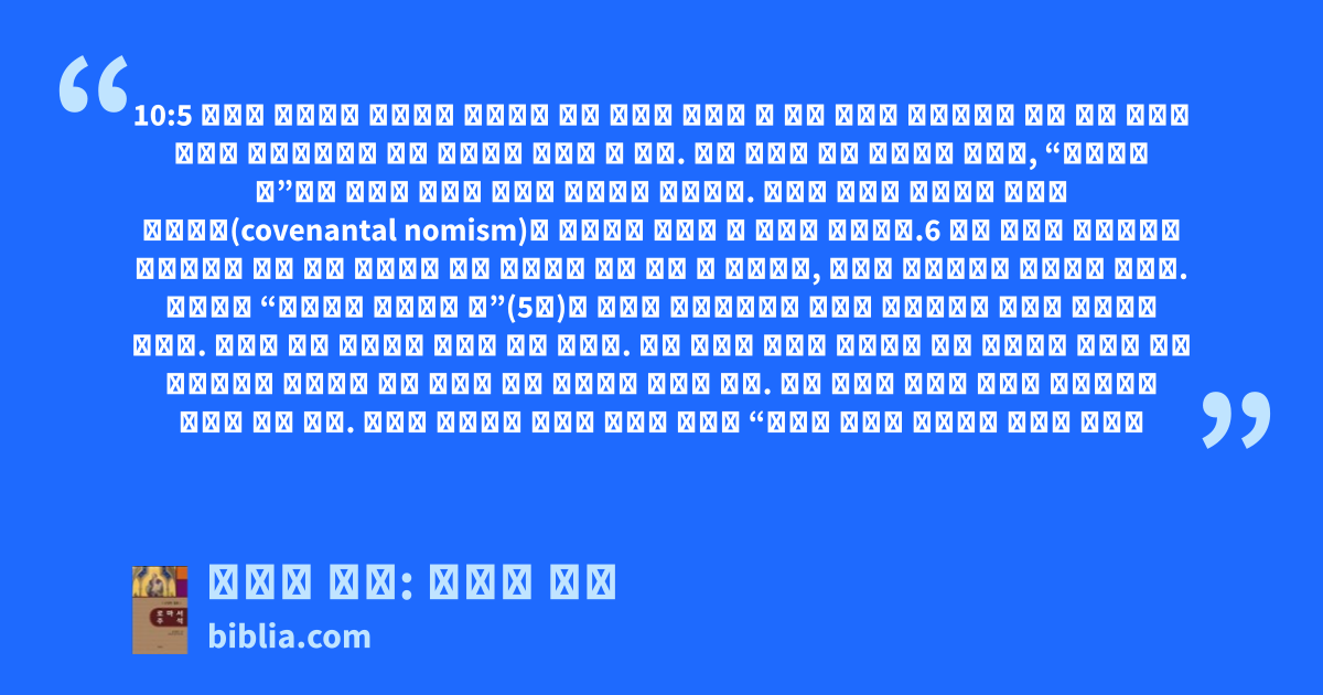 10:5 모세가 기록하되 율법으로 말미암는 의를 행하는 사람은 그 의로 살리라 하였거니와 얼핏 보면 바울이 율법을 준행함으로써 의에 이른다고 말하는 것 같다. 이는 이해할 만한 해석이긴 하지만, “하나님의 의”라는 구약의 언약적 개념을 배제하는 해석이다. 저자는 바울의 서신서를 언약적 율법주의(covenantal nomism)를 배경으로 해석할 수 있다고 제안했다.6 이는 율법이 유대인들을 공포스럽게 하지 않고 하나님이 언약 백성에게 주신 가장 큰 축복이요, 선물로 여겨졌다는 인식과도 통한다. 그렇다면 “율법으로 말미암는 의”(5절)란 율법을 준행함으로써 구원이 보장된다는 의미를 내포하지 않는다. 율법은 그런 목적으로 주어진 것이 아니다. 또한 우리는 구약에 등장하는 의가 하나님의 성품에 관한 것이기보다 하나님의 구원 행위에 관한 것이라고 확인해 왔다. 분명 바울은 율법이 구원을 보장한다고 말하고 있지 않다. 바울이 인용하는 레위기 구절의 요점은 “율법을 지키라 그리하면 구원을 얻으리