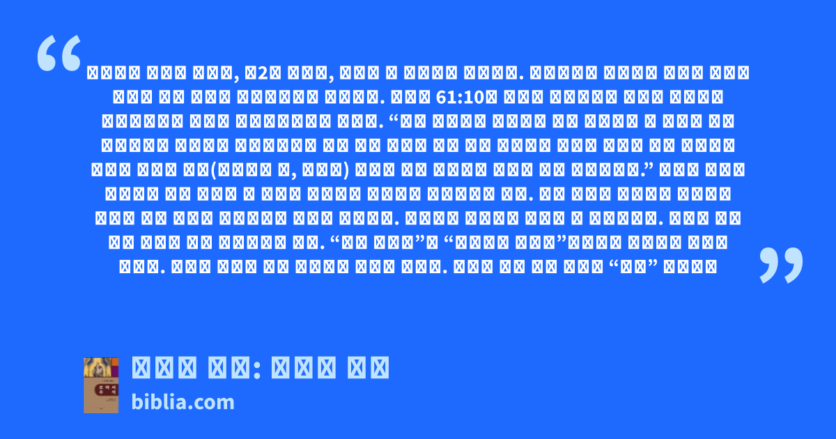 제사장의 주제는 출애굽, 제2의 출애굽, 그리고 새 출애굽의 일부이다. 이스라엘은 여호와의 신부로 구속을 받았을 뿐만 아니라 제사장으로도 세워졌다. 이사야 61:10은 회복된 이스라엘의 모습을 여호와의 신부로서만이 아니라 제사장으로서도 그린다. “내가 여호와로 말미암아 크게 기뻐하며 내 영혼이 나의 하나님으로 말미암아 즐거워하리니 이는 그가 구원의 옷을 내게 입히시며 공의의 겉옷을 내게 더하심이 신랑이 사모를 쓰며(제사장의 관, 새번역) 신부가 자기 보석으로 단장함 같게 하셨음이라.” 이것은 바울이 신자들의 몸을 거룩한 산 제물로 드리라고 권고했던 배경이기도 하다. 이는 동시에 구약에서 제사장이 된다는 것이 무엇을 의미하는지 명확히 말해준다. 하나님의 백성들은 거룩한 산 제물이었다. 이것이 바로 모든 신자의 삶의 토대이기도 하다. “전임 사역자”나 “타문화권 선교사”들에게만 해당하는 사명이 아니다. 그러한 구분은 신약 어디에도 나오지 않는다. 구속을 받은 모든 신자는 “전임” 제사장이