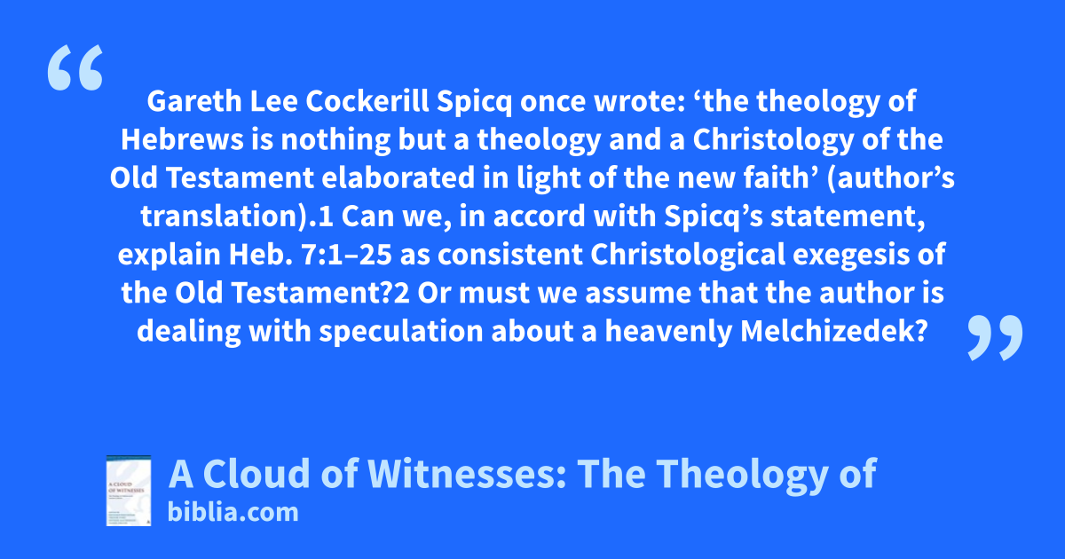 Gareth Lee Cockerill Spicq once wrote: ‘the theology of Hebrews is nothing but a theology and a Christology of the Old Testament elaborated in light of the new faith’ (author’s translation).1 Can we, in accord with Spicq’s statement, explain Heb. 7:1–25 as consistent Christological exegesis of the Old Testament?2 Or must we assume that the author is dealing with speculation about a heavenly Melchizedek?
