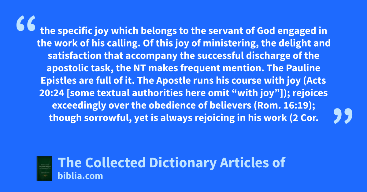 the specific joy which belongs to the servant of God engaged in the work of his calling. Of this joy of ministering, the delight and satisfaction that accompany the successful discharge of the apostolic task, the NT makes frequent mention. The Pauline Epistles are full of it. The Apostle runs his course with joy (Acts 20:24 [some textual authorities here omit “with joy”]); rejoices exceedingly over the obedience of believers (Rom. 16:19); though sorrowful, yet is always rejoicing in his work (2 Cor.