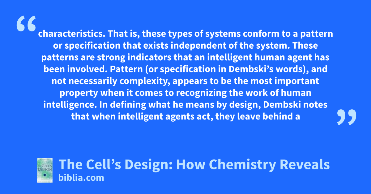 characteristics. That is, these types of systems conform to a pattern or specification that exists independent of the system. These patterns are strong indicators that an intelligent human agent has been involved. Pattern (or specification in Dembski’s words), and not necessarily complexity, appears to be the most important property when it comes to recognizing the work of human intelligence. In defining what he means by design, Dembski notes that when intelligent agents act, they leave behind a
