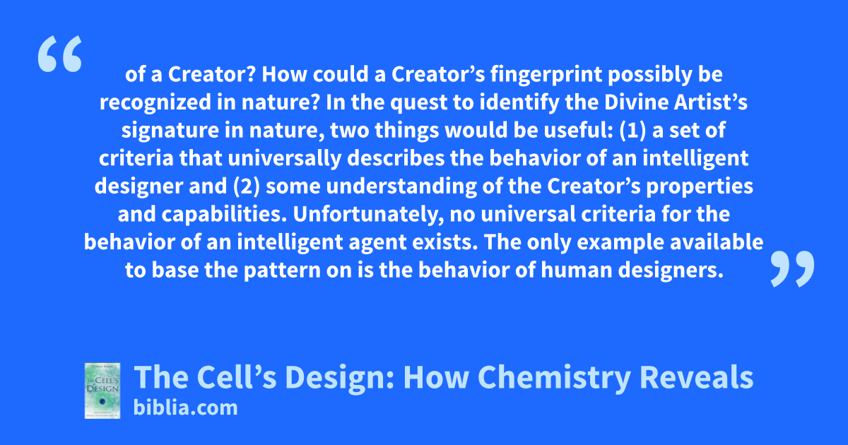 of a Creator? How could a Creator’s fingerprint possibly be recognized in nature? In the quest to identify the Divine Artist’s signature in nature, two things would be useful: (1) a set of criteria that universally describes the behavior of an intelligent designer and (2) some understanding of the Creator’s properties and capabilities. Unfortunately, no universal criteria for the behavior of an intelligent agent exists. The only example available to base the pattern on is the behavior of human designers.