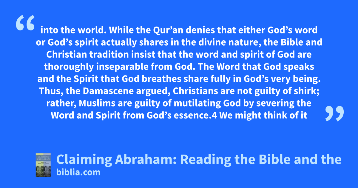 into the world. While the Qur’an denies that either God’s word or God’s spirit actually shares in the divine nature, the Bible and Christian tradition insist that the word and spirit of God are thoroughly inseparable from God. The Word that God speaks and the Spirit that God breathes share fully in God’s very being. Thus, the Damascene argued, Christians are not guilty of shirk; rather, Muslims are guilty of mutilating God by severing the Word and Spirit from God’s essence.4 We might think of it
