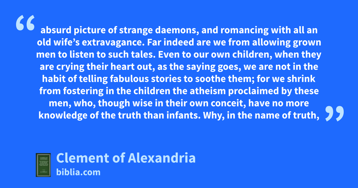 absurd picture of strange daemons, and romancing with all an old wife’s extravagance. Far indeed are we from allowing grown men to listen to such tales. Even to our own children, when they are crying their heart out, as the saying goes, we are not in the habit of telling fabulous stories to soothe them; for we shrink from fostering in the children the atheism proclaimed by these men, who, though wise in their own conceit, have no more knowledge of the truth than infants. Why, in the name of truth,