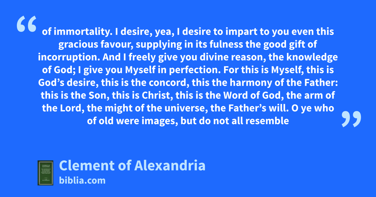 of immortality. I desire, yea, I desire to impart to you even this gracious favour, supplying in its fulness the good gift of incorruption. And I freely give you divine reason, the knowledge of God; I give you Myself in perfection. For this is Myself, this is God’s desire, this is the concord, this the harmony of the Father: this is the Son, this is Christ, this is the Word of God, the arm of the Lord, the might of the universe, the Father’s will. O ye who of old were images, but do not all resemble