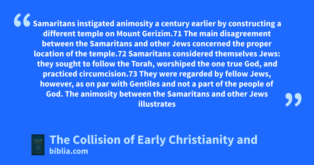 Samaritans instigated animosity a century earlier by constructing a different temple on Mount Gerizim.71 The main disagreement between the Samaritans and other Jews concerned the proper location of the temple.72 Samaritans considered themselves Jews: they sought to follow the Torah, worshiped the one true God, and practiced circumcision.73 They were regarded by fellow Jews, however, as on par with Gentiles and not a part of the people of God. The animosity between the Samaritans and other Jews illustrates