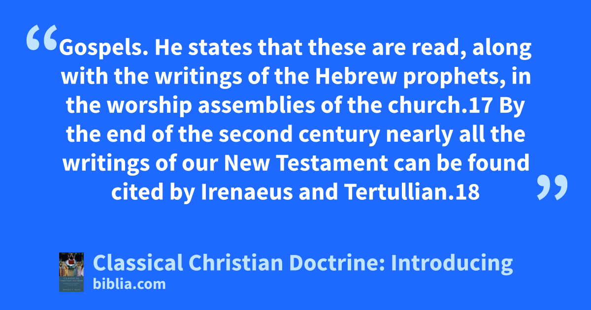 Gospels. He states that these are read, along with the writings of the Hebrew prophets, in the worship assemblies of the church.17 By the end of the second century nearly all the writings of our New Testament can be found cited by Irenaeus and Tertullian.18