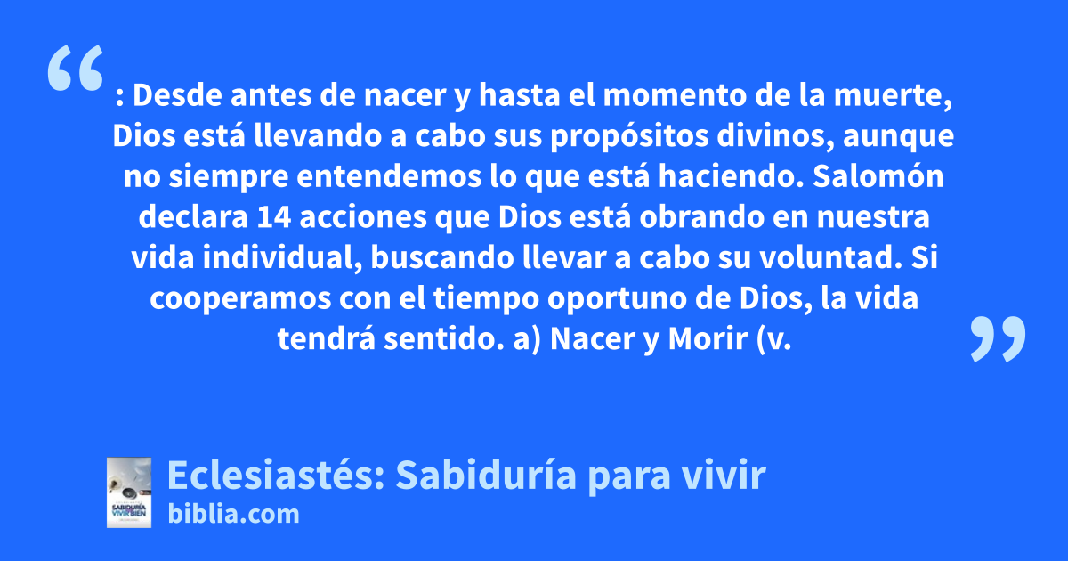 : Desde antes de nacer y hasta el momento de la muerte, Dios está llevando a cabo sus propósitos divinos, aunque no siempre entendemos lo que está haciendo. Salomón declara 14 acciones que Dios está obrando en nuestra vida individual, buscando llevar a cabo su voluntad. Si cooperamos con el tiempo oportuno de Dios, la vida tendrá sentido. a) Nacer y Morir (v.
