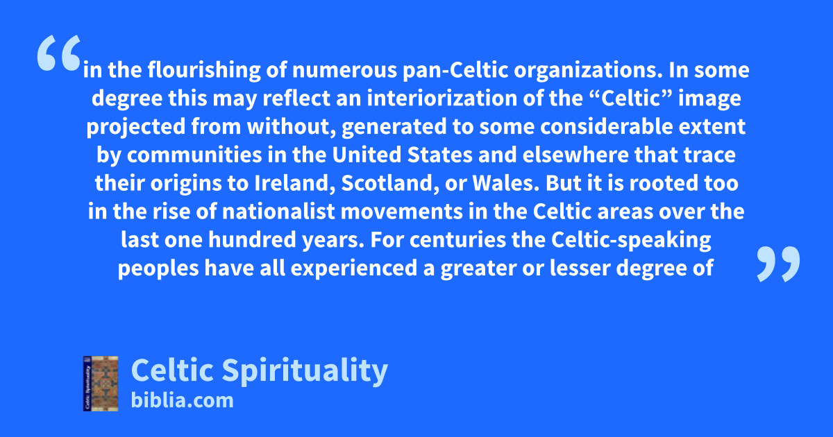 in the flourishing of numerous pan-Celtic organizations. In some degree this may reflect an interiorization of the “Celtic” image projected from without, generated to some considerable extent by communities in the United States and elsewhere that trace their origins to Ireland, Scotland, or Wales. But it is rooted too in the rise of nationalist movements in the Celtic areas over the last one hundred years. For centuries the Celtic-speaking peoples have all experienced a greater or lesser degree of