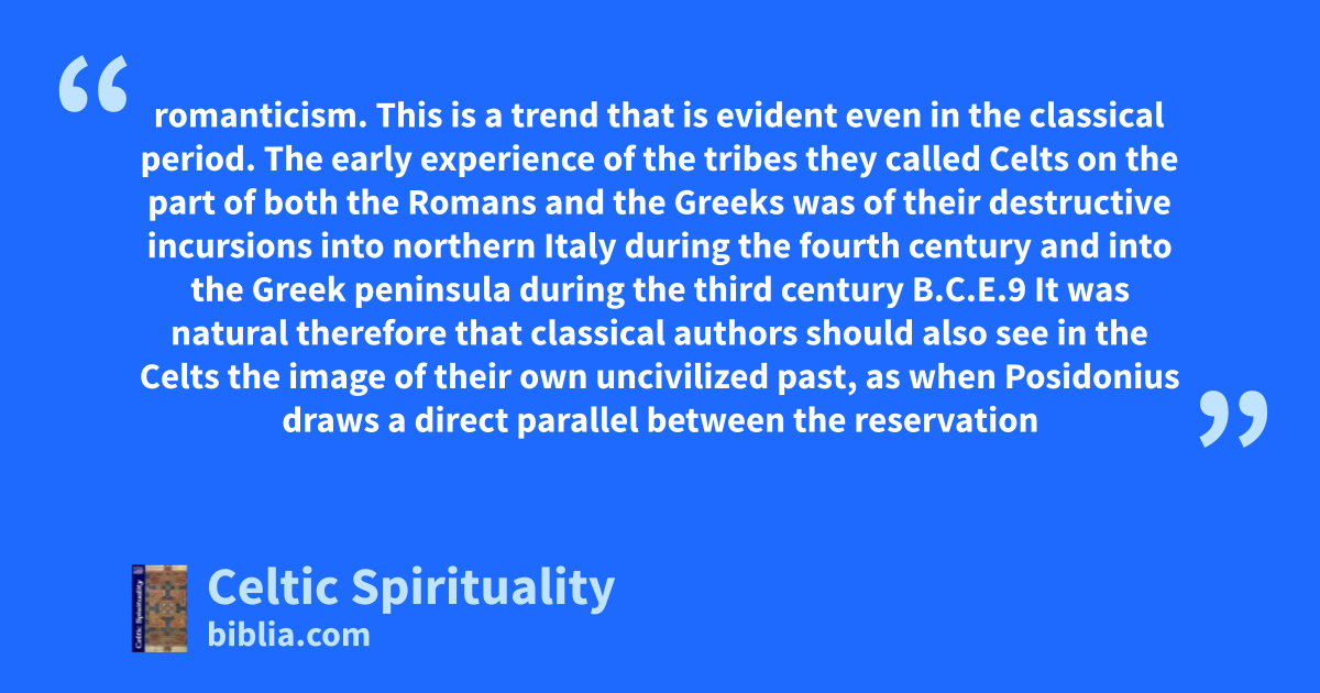 romanticism. This is a trend that is evident even in the classical period. The early experience of the tribes they called Celts on the part of both the Romans and the Greeks was of their destructive incursions into northern Italy during the fourth century and into the Greek peninsula during the third century B.C.E.9 It was natural therefore that classical authors should also see in the Celts the image of their own uncivilized past, as when Posidonius draws a direct parallel between the reservation