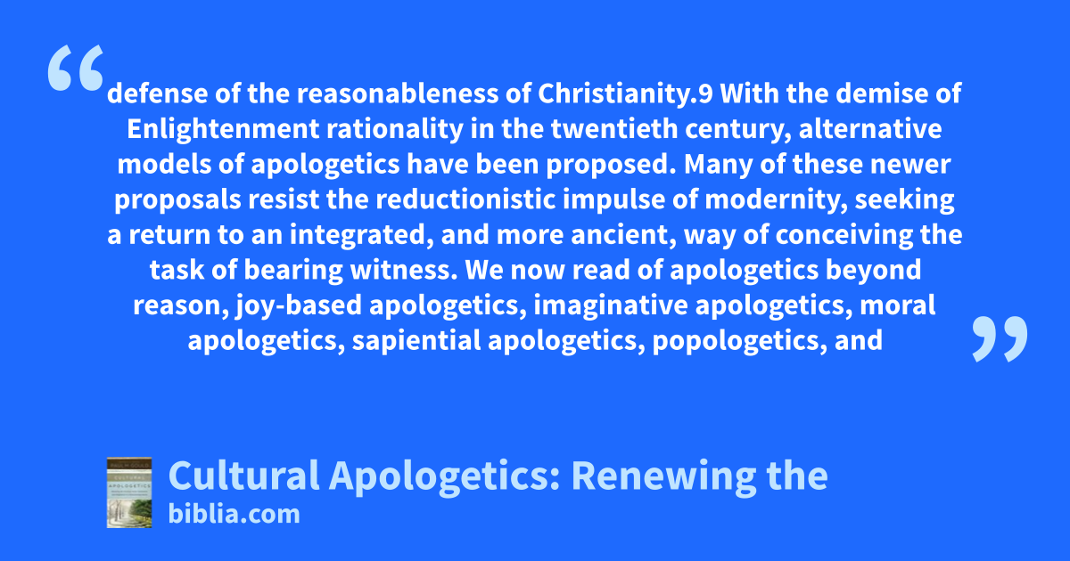 defense of the reasonableness of Christianity.9 With the demise of Enlightenment rationality in the twentieth century, alternative models of apologetics have been proposed. Many of these newer proposals resist the reductionistic impulse of modernity, seeking a return to an integrated, and more ancient, way of conceiving the task of bearing witness. We now read of apologetics beyond reason, joy-based apologetics, imaginative apologetics, moral apologetics, sapiential apologetics, popologetics, and