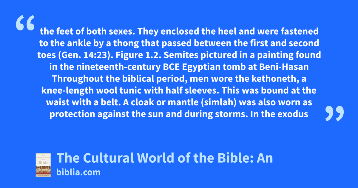 the feet of both sexes. They enclosed the heel and were fastened to the ankle by a thong that passed between the first and second toes (Gen. 14:23). Figure 1.2. Semites pictured in a painting found in the nineteenth-century BCE Egyptian tomb at Beni-Hasan Throughout the biblical period, men wore the kethoneth, a knee-length wool tunic with half sleeves. This was bound at the waist with a belt. A cloak or mantle (simlah) was also worn as protection against the sun and during storms. In the exodus