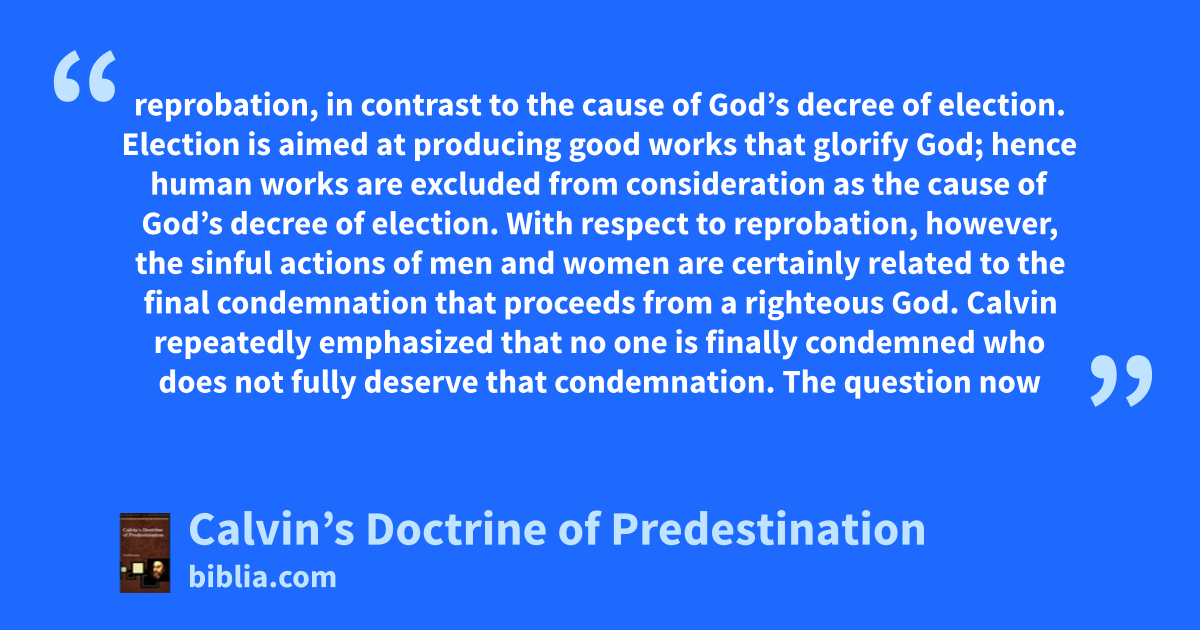 reprobation, in contrast to the cause of God’s decree of election. Election is aimed at producing good works that glorify God; hence human works are excluded from consideration as the cause of God’s decree of election. With respect to reprobation, however, the sinful actions of men and women are certainly related to the final condemnation that proceeds from a righteous God. Calvin repeatedly emphasized that no one is finally condemned who does not fully deserve that condemnation. The question now