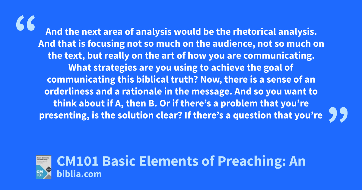 And the next area of analysis would be the rhetorical analysis. And that is focusing not so much on the audience, not so much on the text, but really on the art of how you are communicating. What strategies are you using to achieve the goal of communicating this biblical truth? Now, there is a sense of an orderliness and a rationale in the message. And so you want to think about if A, then B. Or if there’s a problem that you’re presenting, is the solution clear? If there’s a question that you’re