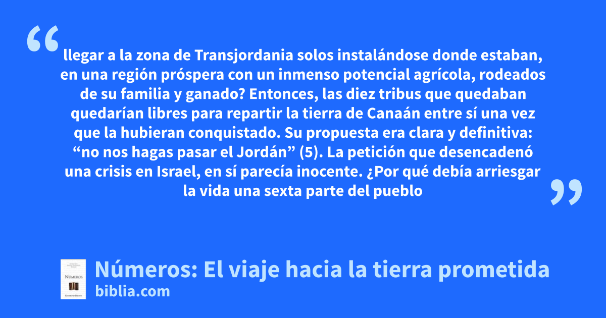 llegar a la zona de Transjordania solos instalándose donde estaban, en una región próspera con un inmenso potencial agrícola, rodeados de su familia y ganado? Entonces, las diez tribus que quedaban quedarían libres para repartir la tierra de Canaán entre sí una vez que la hubieran conquistado. Su propuesta era clara y definitiva: “no nos hagas pasar el Jordán” (5). La petición que desencadenó una crisis en Israel, en sí parecía inocente. ¿Por qué debía arriesgar la vida una sexta parte del pueblo