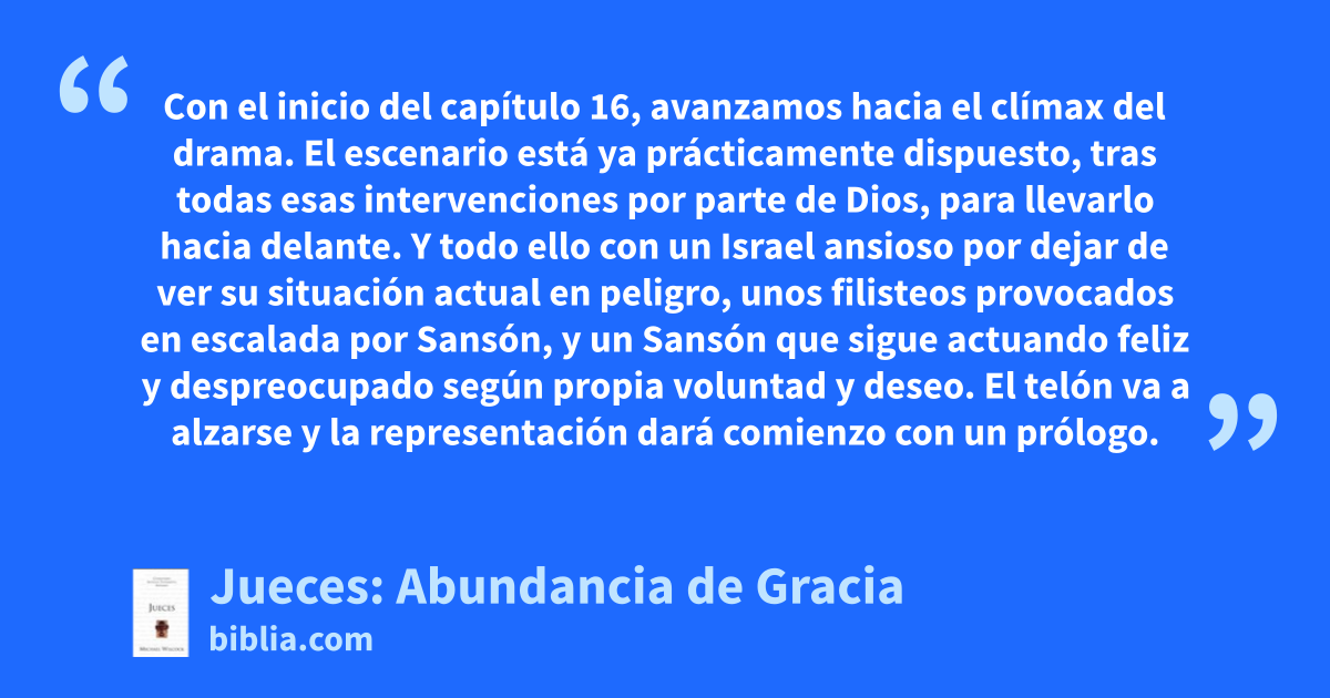 Con el inicio del capítulo 16, avanzamos hacia el clímax del drama. El escenario está ya prácticamente dispuesto, tras todas esas intervenciones por parte de Dios, para llevarlo hacia delante. Y todo ello con un Israel ansioso por dejar de ver su situación actual en peligro, unos filisteos provocados en escalada por Sansón, y un Sansón que sigue actuando feliz y despreocupado según propia voluntad y deseo. El telón va a alzarse y la representación dará comienzo con un prólogo.