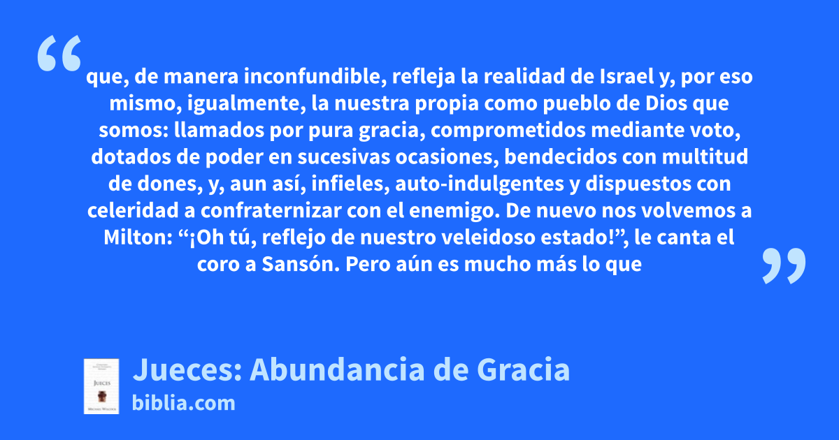 que, de manera inconfundible, refleja la realidad de Israel y, por eso mismo, igualmente, la nuestra propia como pueblo de Dios que somos: llamados por pura gracia, comprometidos mediante voto, dotados de poder en sucesivas ocasiones, bendecidos con multitud de dones, y, aun así, infieles, auto-indulgentes y dispuestos con celeridad a confraternizar con el enemigo. De nuevo nos volvemos a Milton: “¡Oh tú, reflejo de nuestro veleidoso estado!”, le canta el coro a Sansón. Pero aún es mucho más lo que