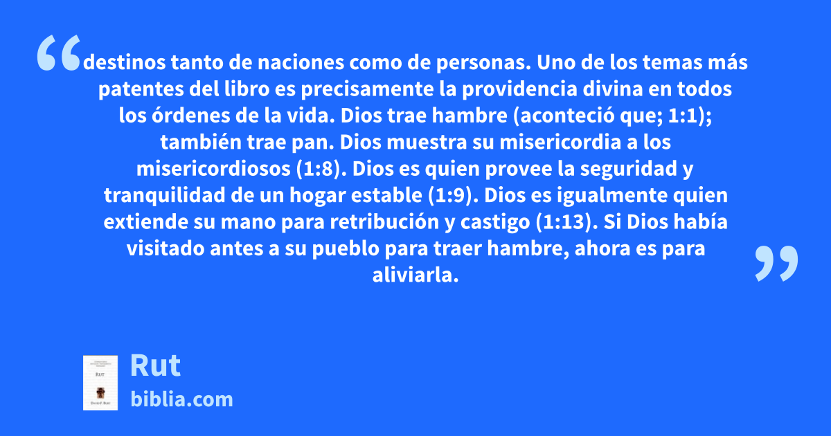 destinos tanto de naciones como de personas. Uno de los temas más patentes del libro es precisamente la providencia divina en todos los órdenes de la vida. Dios trae hambre (aconteció que; 1:1); también trae pan. Dios muestra su misericordia a los misericordiosos (1:8). Dios es quien provee la seguridad y tranquilidad de un hogar estable (1:9). Dios es igualmente quien extiende su mano para retribución y castigo (1:13). Si Dios había visitado antes a su pueblo para traer hambre, ahora es para aliviarla.