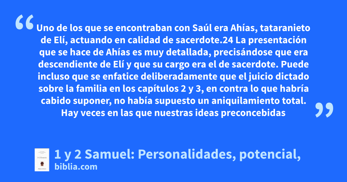 Uno de los que se encontraban con Saúl era Ahías, tataranieto de Elí, actuando en calidad de sacerdote.24 La presentación que se hace de Ahías es muy detallada, precisándose que era descendiente de Elí y que su cargo era el de sacerdote. Puede incluso que se enfatice deliberadamente que el juicio dictado sobre la familia en los capítulos 2 y 3, en contra lo que habría cabido suponer, no había supuesto un aniquilamiento total. Hay veces en las que nuestras ideas preconcebidas