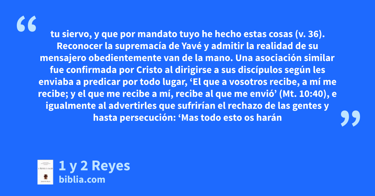 tu siervo, y que por mandato tuyo he hecho estas cosas (v. 36). Reconocer la supremacía de Yavé y admitir la realidad de su mensajero obedientemente van de la mano. Una asociación similar fue confirmada por Cristo al dirigirse a sus discípulos según les enviaba a predicar por todo lugar, ‘El que a vosotros recibe, a mí me recibe; y el que me recibe a mí, recibe al que me envió’ (Mt. 10:40), e igualmente al advertirles que sufrirían el rechazo de las gentes y hasta persecución: ‘Mas todo esto os harán