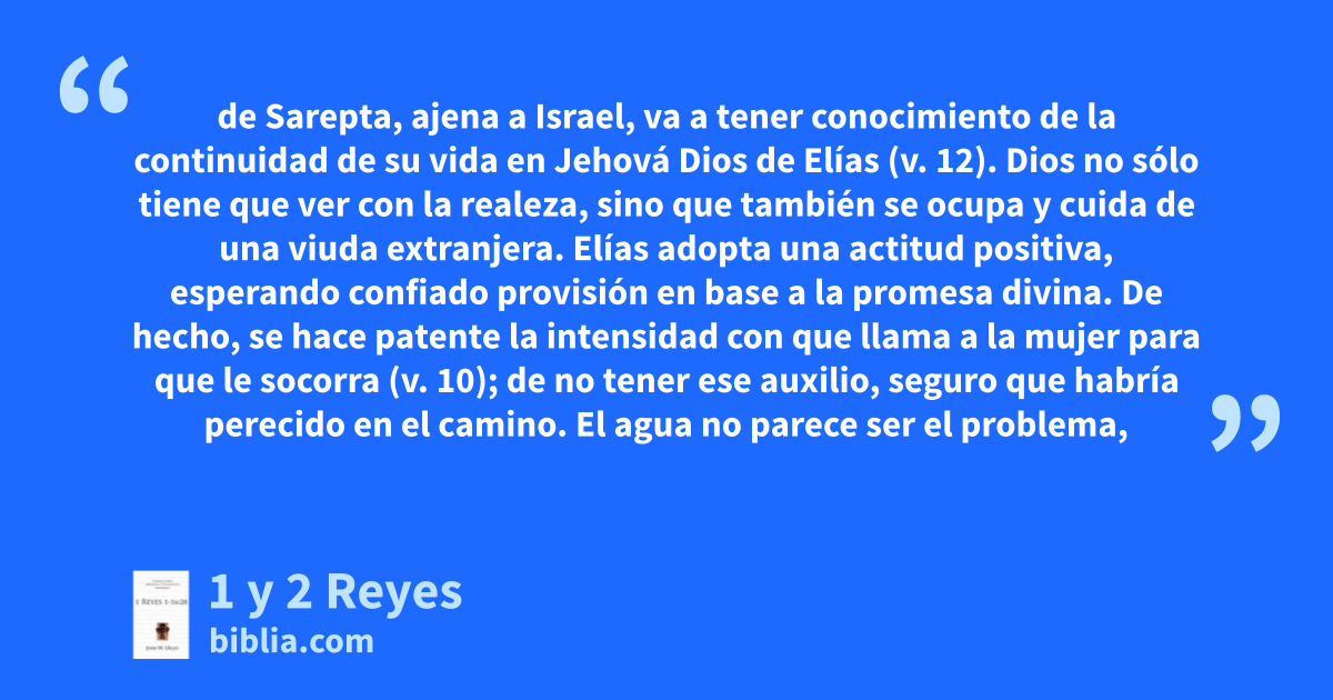 de Sarepta, ajena a Israel, va a tener conocimiento de la continuidad de su vida en Jehová Dios de Elías (v. 12). Dios no sólo tiene que ver con la realeza, sino que también se ocupa y cuida de una viuda extranjera. Elías adopta una actitud positiva, esperando confiado provisión en base a la promesa divina. De hecho, se hace patente la intensidad con que llama a la mujer para que le socorra (v. 10); de no tener ese auxilio, seguro que habría perecido en el camino. El agua no parece ser el problema,