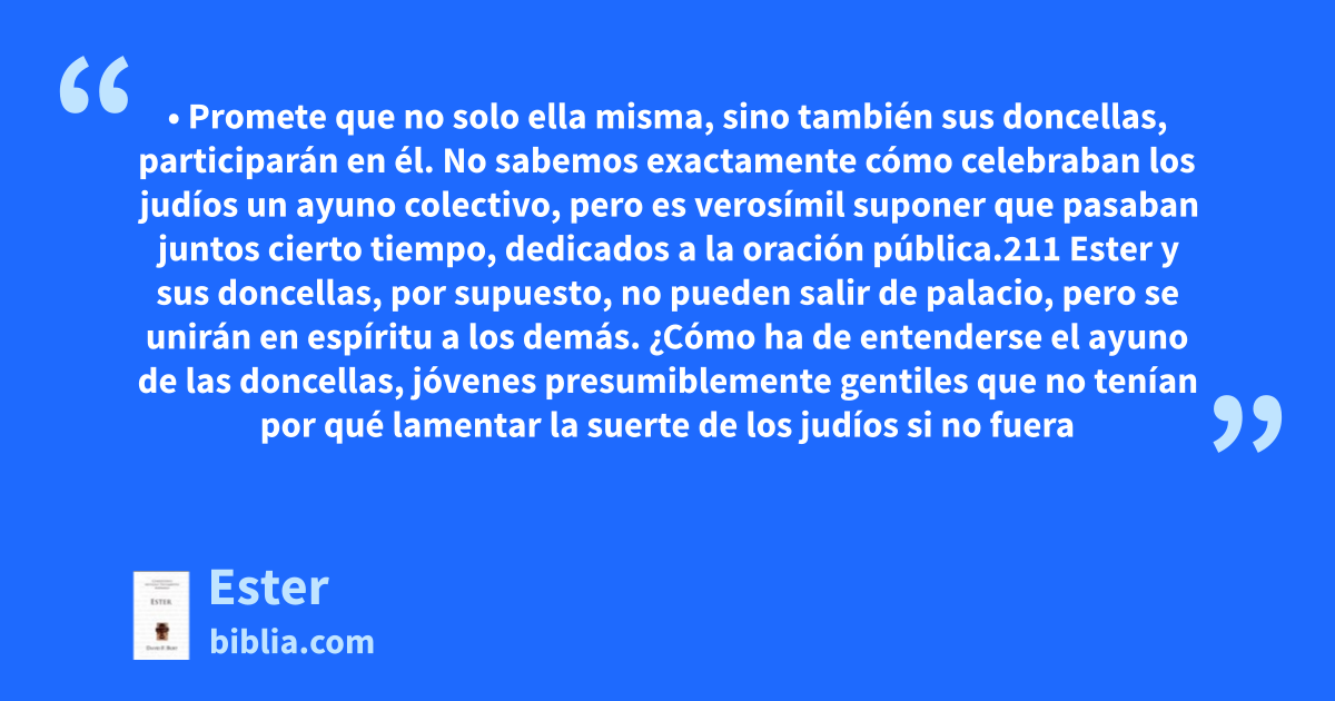 • Promete que no solo ella misma, sino también sus doncellas, participarán en él. No sabemos exactamente cómo celebraban los judíos un ayuno colectivo, pero es verosímil suponer que pasaban juntos cierto tiempo, dedicados a la oración pública.211 Ester y sus doncellas, por supuesto, no pueden salir de palacio, pero se unirán en espíritu a los demás. ¿Cómo ha de entenderse el ayuno de las doncellas, jóvenes presumiblemente gentiles que no tenían por qué lamentar la suerte de los judíos si no fuera