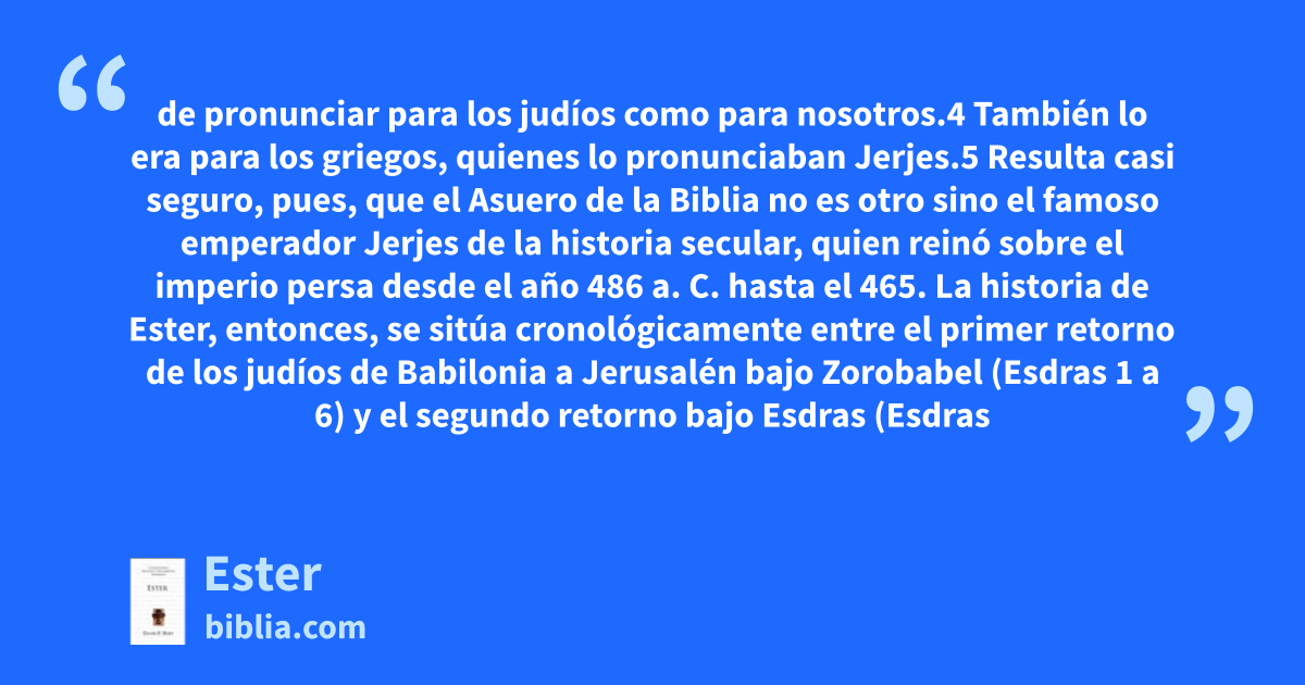 de pronunciar para los judíos como para nosotros.4 También lo era para los griegos, quienes lo pronunciaban Jerjes.5 Resulta casi seguro, pues, que el Asuero de la Biblia no es otro sino el famoso emperador Jerjes de la historia secular, quien reinó sobre el imperio persa desde el año 486 a. C. hasta el 465. La historia de Ester, entonces, se sitúa cronológicamente entre el primer retorno de los judíos de Babilonia a Jerusalén bajo Zorobabel (Esdras 1 a 6) y el segundo retorno bajo Esdras (Esdras