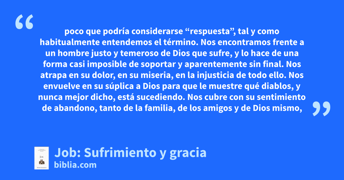 poco que podría considerarse “respuesta”, tal y como habitualmente entendemos el término. Nos encontramos frente a un hombre justo y temeroso de Dios que sufre, y lo hace de una forma casi imposible de soportar y aparentemente sin final. Nos atrapa en su dolor, en su miseria, en la injusticia de todo ello. Nos envuelve en su súplica a Dios para que le muestre qué diablos, y nunca mejor dicho, está sucediendo. Nos cubre con su sentimiento de abandono, tanto de la familia, de los amigos y de Dios mismo,