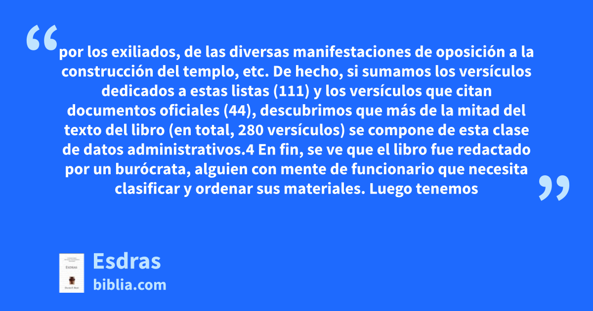por los exiliados, de las diversas manifestaciones de oposición a la construcción del templo, etc. De hecho, si sumamos los versículos dedicados a estas listas (111) y los versículos que citan documentos oficiales (44), descubrimos que más de la mitad del texto del libro (en total, 280 versículos) se compone de esta clase de datos administrativos.4 En fin, se ve que el libro fue redactado por un burócrata, alguien con mente de funcionario que necesita clasificar y ordenar sus materiales. Luego tenemos