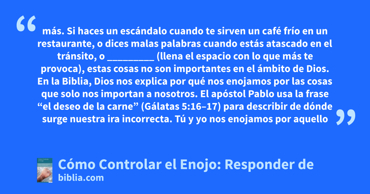 más. Si haces un escándalo cuando te sirven un café frío en un restaurante, o dices malas palabras cuando estás atascado en el tránsito, o _________ (llena el espacio con lo que más te provoca), estas cosas no son importantes en el ámbito de Dios. En la Biblia, Dios nos explica por qué nos enojamos por las cosas que solo nos importan a nosotros. El apóstol Pablo usa la frase “el deseo de la carne” (Gálatas 5:16–17) para describir de dónde surge nuestra ira incorrecta. Tú y yo nos enojamos por aquello