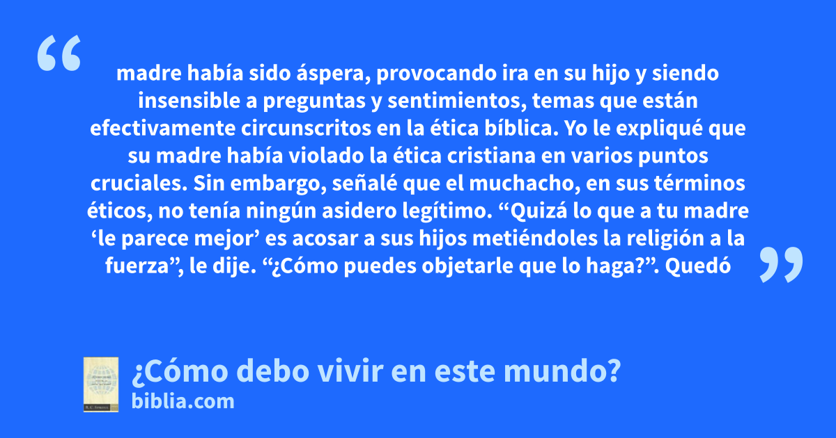 madre había sido áspera, provocando ira en su hijo y siendo insensible a preguntas y sentimientos, temas que están efectivamente circunscritos en la ética bíblica. Yo le expliqué que su madre había violado la ética cristiana en varios puntos cruciales. Sin embargo, señalé que el muchacho, en sus términos éticos, no tenía ningún asidero legítimo. “Quizá lo que a tu madre ‘le parece mejor’ es acosar a sus hijos metiéndoles la religión a la fuerza”, le dije. “¿Cómo puedes objetarle que lo haga?”. Quedó
