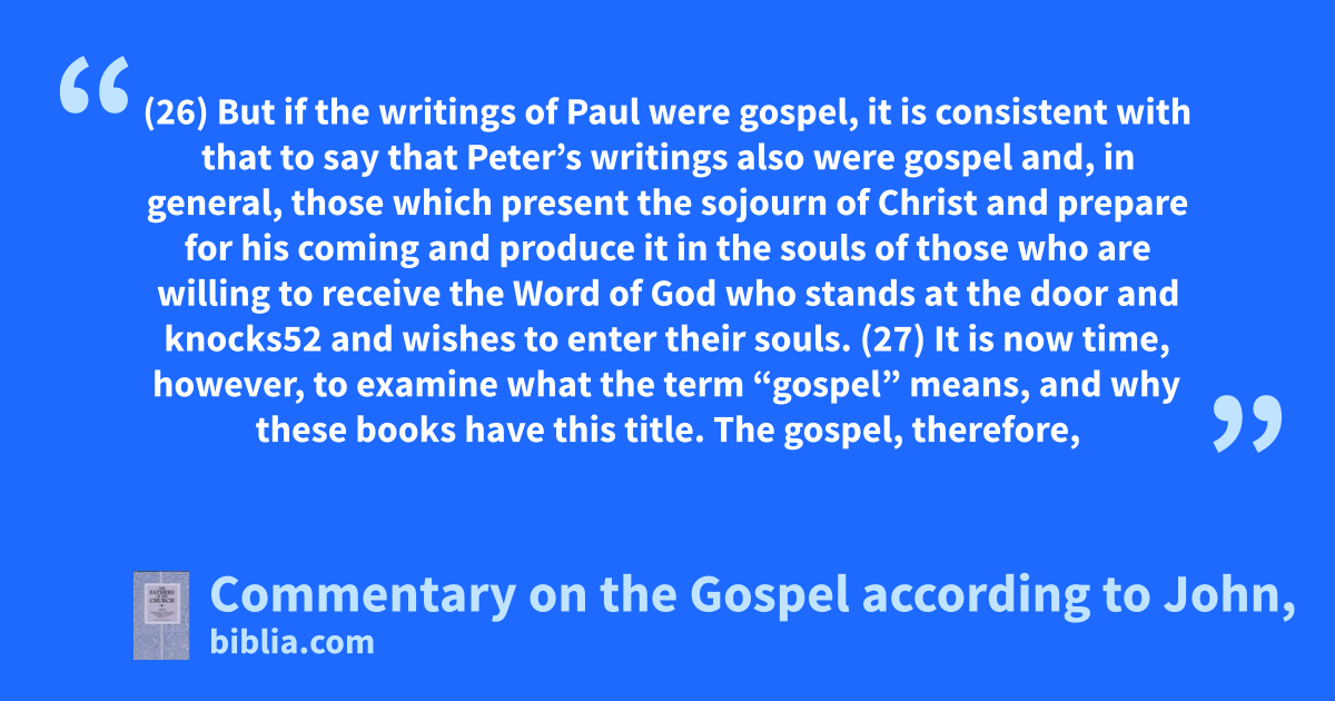 Origen composed at least 32 books of a commentary on the Gospel according to John, at the request of St. Ambrose of Milan. Of these, only nine books are extant in almost complete form, although we have selections of others persevered in other collections of the works of Origen. The commentary proceeds verse by verse, and is particularly notable for its emphasis on the spiritual meaning of the...
