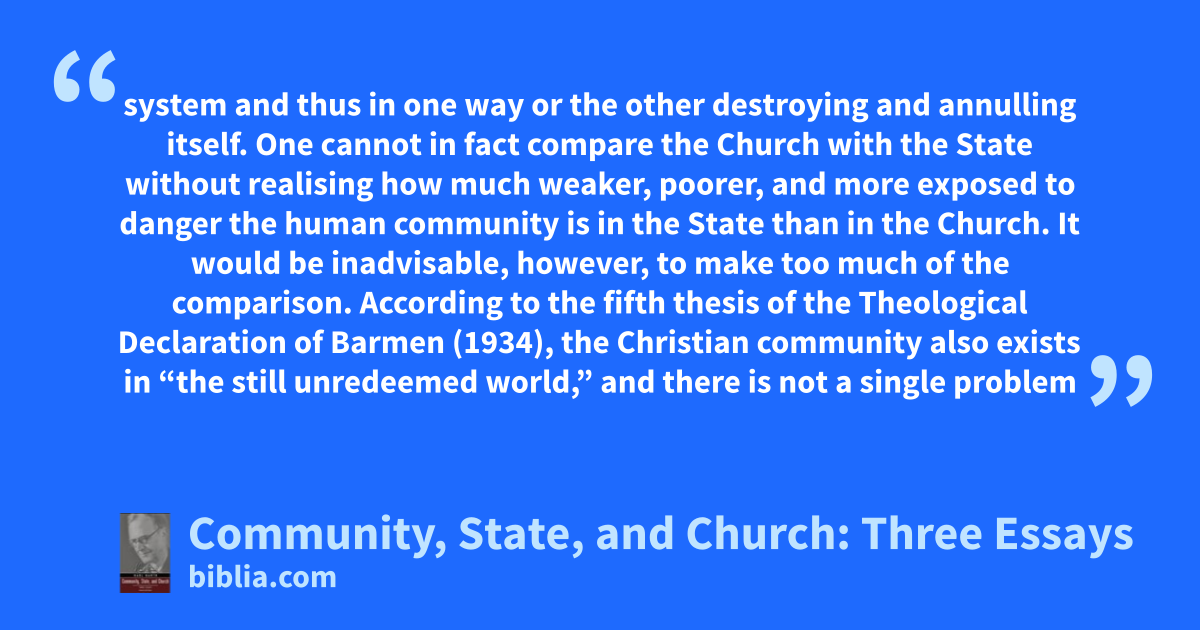 system and thus in one way or the other destroying and annulling itself. One cannot in fact compare the Church with the State without realising how much weaker, poorer, and more exposed to danger the human community is in the State than in the Church. It would be inadvisable, however, to make too much of the comparison. According to the fifth thesis of the Theological Declaration of Barmen (1934), the Christian community also exists in “the still unredeemed world,” and there is not a single problem