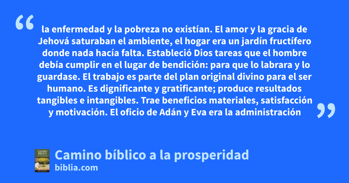 la enfermedad y la pobreza no existían. El amor y la gracia de Jehová saturaban el ambiente, el hogar era un jardín fructífero donde nada hacía falta. Estableció Dios tareas que el hombre debía cumplir en el lugar de bendición: para que lo labrara y lo guardase. El trabajo es parte del plan original divino para el ser humano. Es dignificante y gratificante; produce resultados tangibles e intangibles. Trae beneficios materiales, satisfacción y motivación. El oficio de Adán y Eva era la administración