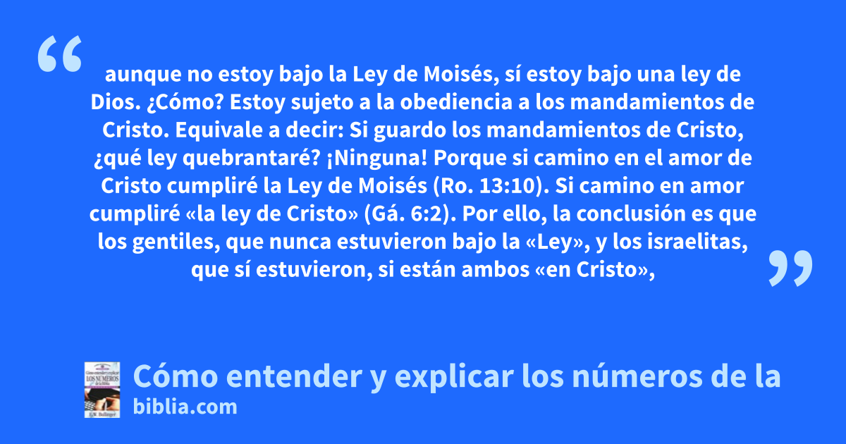 aunque no estoy bajo la Ley de Moisés, sí estoy bajo una ley de Dios. ¿Cómo? Estoy sujeto a la obediencia a los mandamientos de Cristo. Equivale a decir: Si guardo los mandamientos de Cristo, ¿qué ley quebrantaré? ¡Ninguna! Porque si camino en el amor de Cristo cumpliré la Ley de Moisés (Ro. 13:10). Si camino en amor cumpliré «la ley de Cristo» (Gá. 6:2). Por ello, la conclusión es que los gentiles, que nunca estuvieron bajo la «Ley», y los israelitas, que sí estuvieron, si están ambos «en Cristo»,