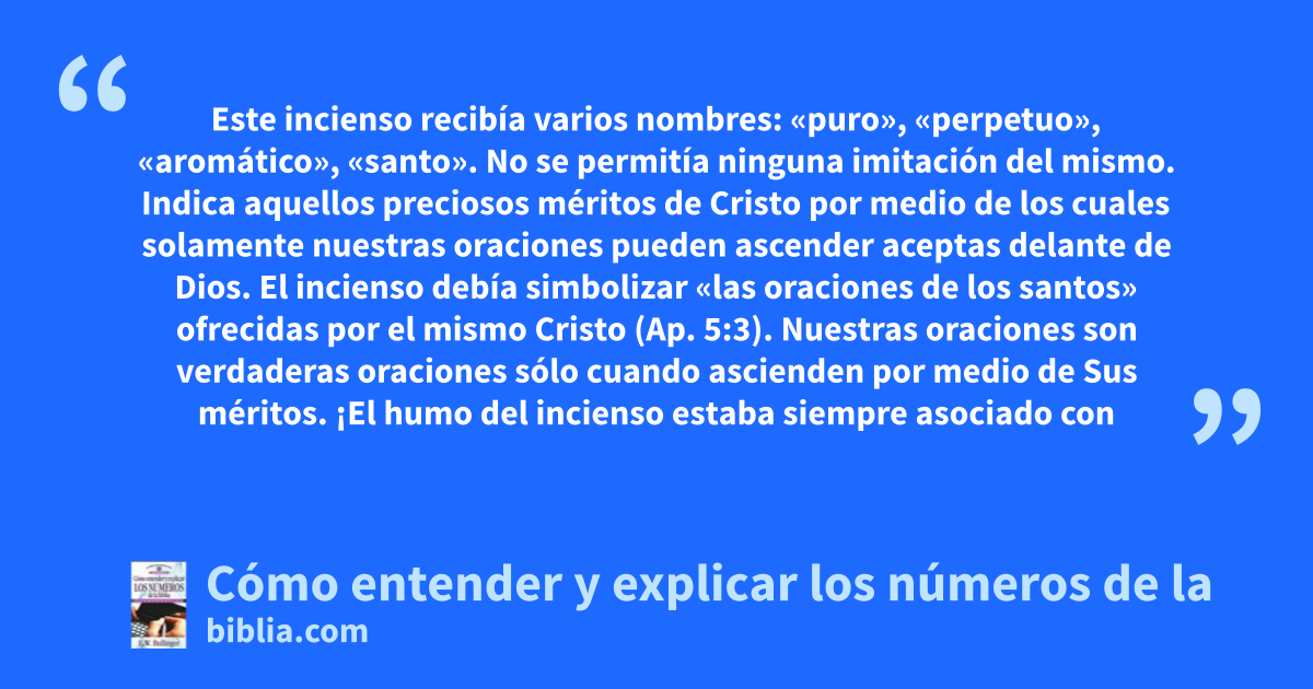 Este incienso recibía varios nombres: «puro», «perpetuo», «aromático», «santo». No se permitía ninguna imitación del mismo. Indica aquellos preciosos méritos de Cristo por medio de los cuales solamente nuestras oraciones pueden ascender aceptas delante de Dios. El incienso debía simbolizar «las oraciones de los santos» ofrecidas por el mismo Cristo (Ap. 5:3). Nuestras oraciones son verdaderas oraciones sólo cuando ascienden por medio de Sus méritos. ¡El humo del incienso estaba siempre asociado con