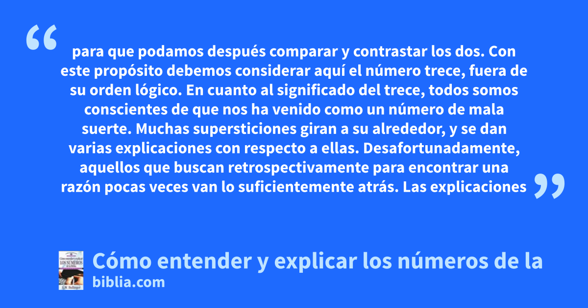 para que podamos después comparar y contrastar los dos. Con este propósito debemos considerar aquí el número trece, fuera de su orden lógico. En cuanto al significado del trece, todos somos conscientes de que nos ha venido como un número de mala suerte. Muchas supersticiones giran a su alrededor, y se dan varias explicaciones con respecto a ellas. Desafortunadamente, aquellos que buscan retrospectivamente para encontrar una razón pocas veces van lo suficientemente atrás. Las explicaciones